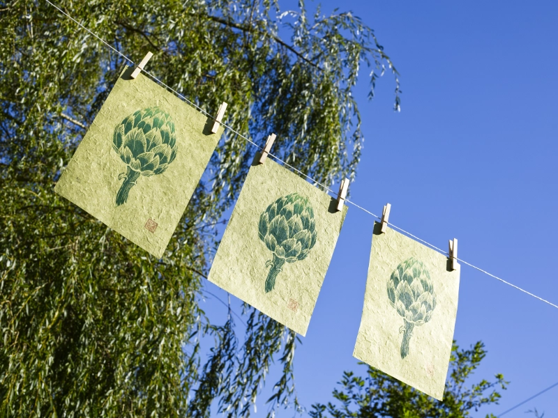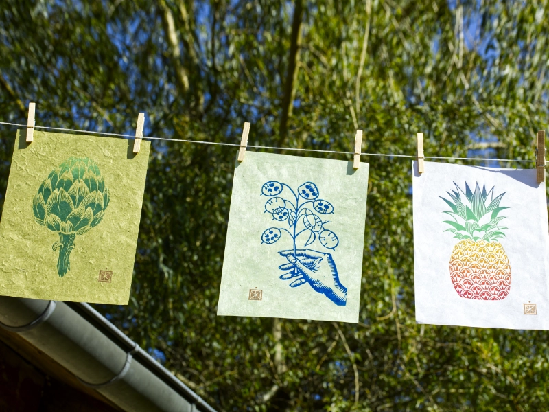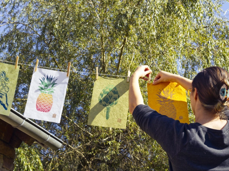 Le papier lokta, un papier népalais artisanal qui laisse voir la fibre végétale, met en valeur le sujet graphique et s’accorde avec la thématique. Et l’encre, en léger dégradé sur la pointe, donne à cet artichaut un petit côté magique, comme éclairé par le dessus…