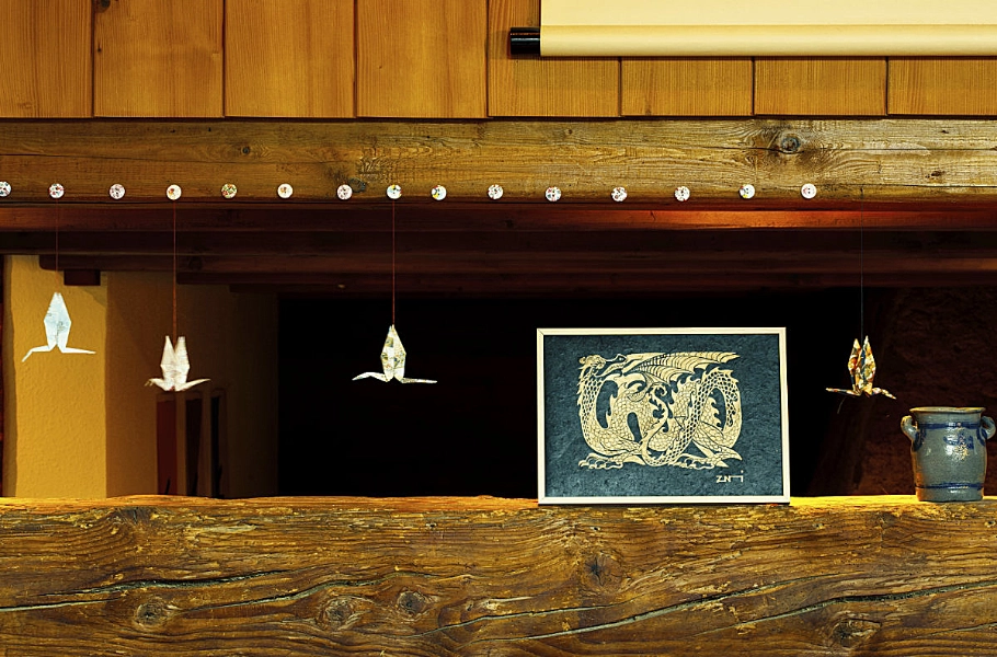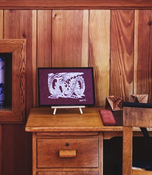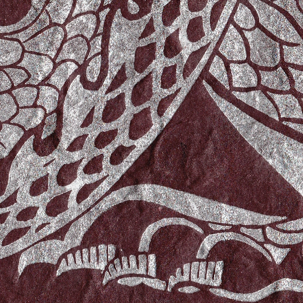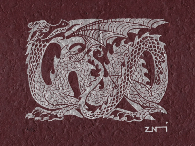 Que ce soit dans sa version dorée sur noir ou argent sur bordeaux, ce dragon a des allures d’armoiries médiévales – il aurait sa place sur le bouclier d’un chevalier ! Le sujet fait la part belle aux motifs, pour occuper au maximum l’espace défini.