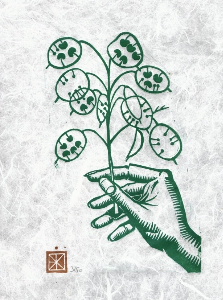 J’aime presque tout dans la monnaie-du-pape : c’est une plante qui pousse facilement ; elle fait de jolies petites fleurs violettes et plus tard des fruits ronds et plats, opales, qui laissent voir les graines à l’intérieur. La seule chose que je n’aime pas, c’est son nom – aussi, j’ai été ravie d’apprendre qu’elle s’appelle aussi lunaire annuelle en française – et honesty en anglais, puisqu’elle laisse voir ses graines par transparence.