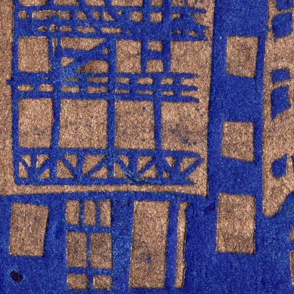 – une impression en deux passages : une silhouette bleue et les détails à l’encre cuivrée.