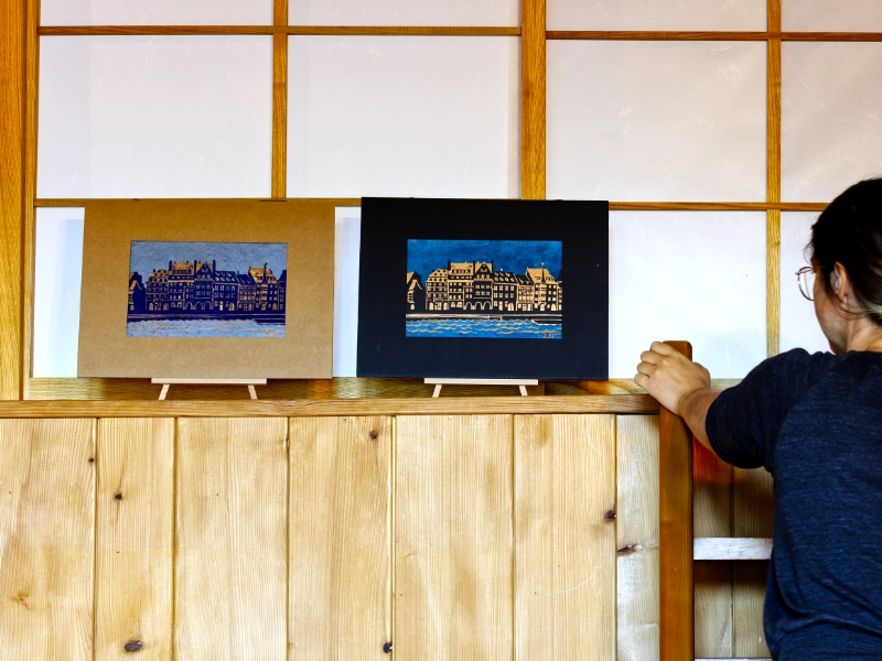 – une impression cuivrée sur papier noir, où le ciel et l’eau sont reconstitués par des papiers découpés (voir image principale) ;