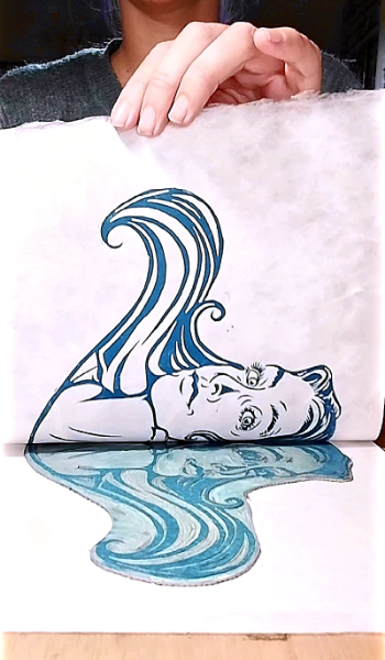 Après les deux premiers volets, “écouter” et “regarder” qui sont contenus dans une forme générale donnée par le mouvement des cheveux, “s’exprimer” part dans toutes les directions – les mèches rappellent les cheveux-serpents de la Méduse ou une tempête de mer – ce qui en fait ma préférée de cette série.